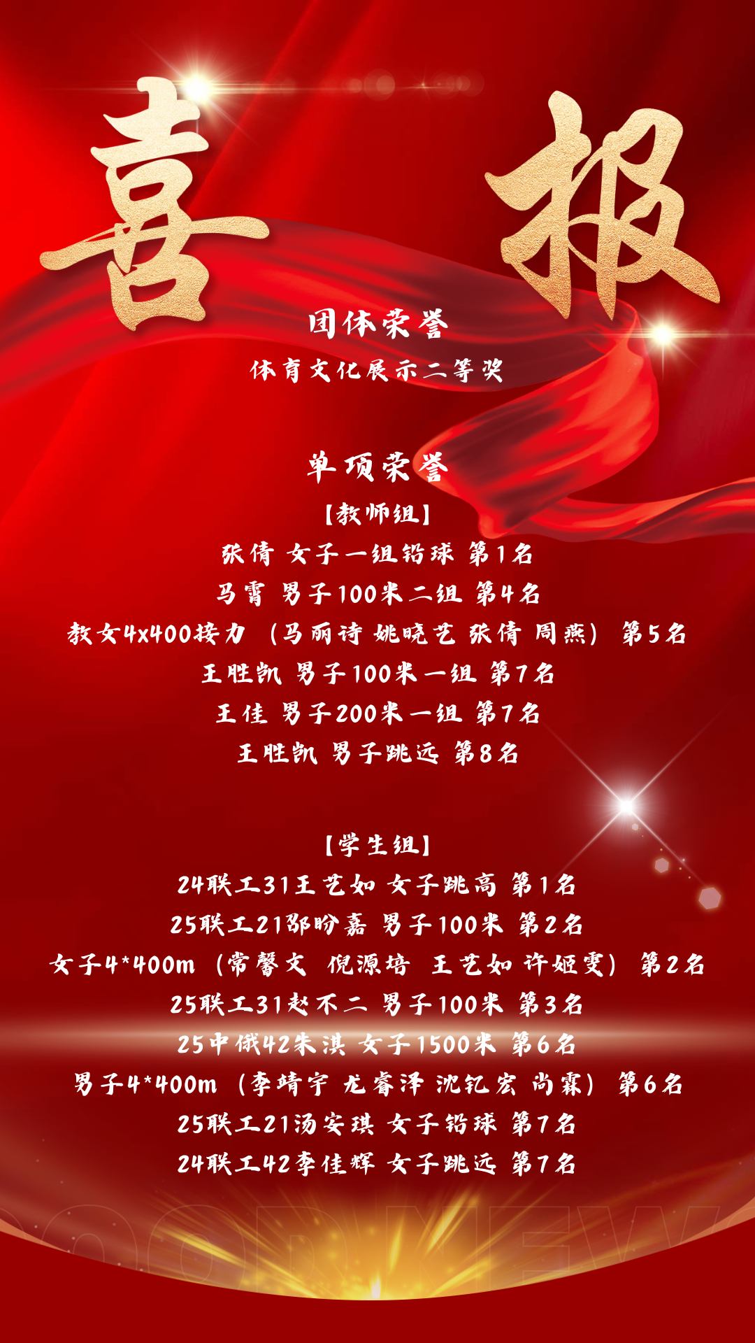 经过两天的激烈角逐,中俄学院运动健儿们凭借过硬的实力与顽强的意志,最终获得体育文化展示二等奖、学生女子跳高第一名、教师女子铅球第一名等多项荣誉!