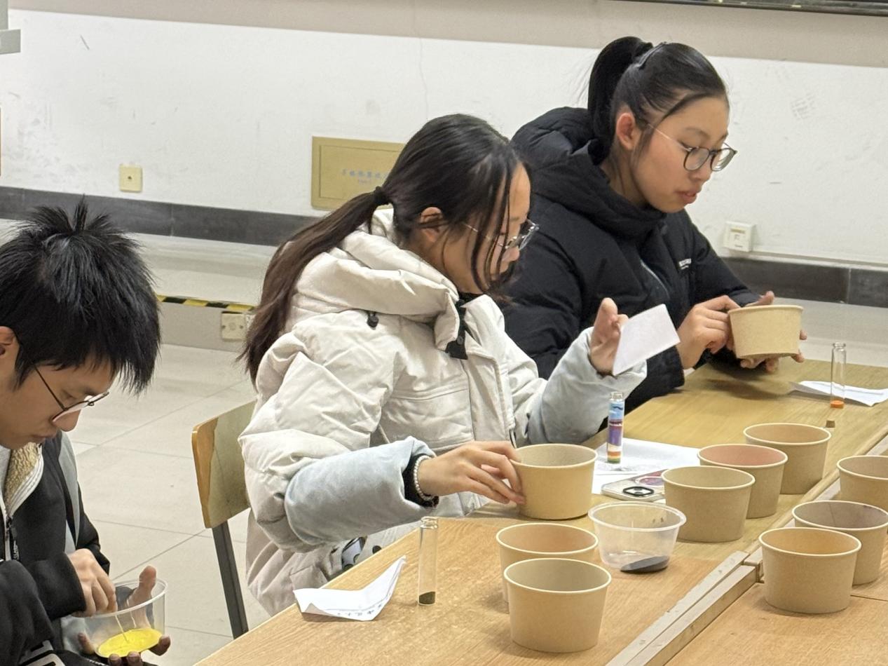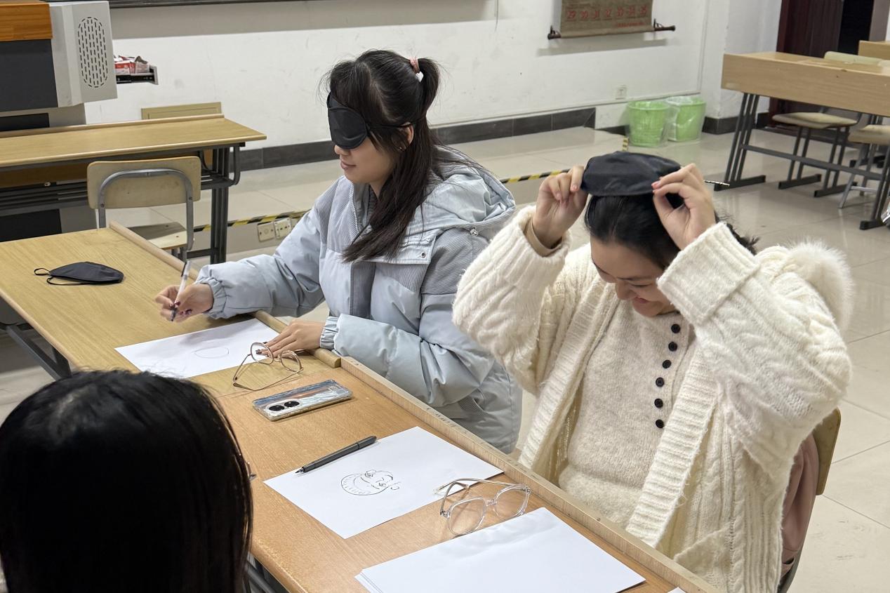 现场设置了“蒙眼自画像”“‘盒’你倾诉--匿名信箱”“玻璃瓶沙画”三个活动,在“蒙眼自画像”活动中,同学们戴上遮光眼罩,凭触觉与内心记忆,通过左手摸脸、右手绘画的方式完成自画像,创作过程中,大家暂时脱离视觉干扰,专注于内在感受;在“‘盒’你倾诉--匿名信箱”活动中,同学们用黑色签字笔在便利贴上写下未说出口的烦恼、秘密或幸运事,投入箱子后抽取他人的留言,并用红色签字笔写下鼓励与祝福贴于展示板,传递陌生人之间的善意;在“玻璃瓶沙画”活动中,同学们挑选不同颜色彩砂,在玻璃瓶中分层填充,将当下的心情、小目标通过色彩层次含蓄表达,活动现场氛围轻松愉悦。